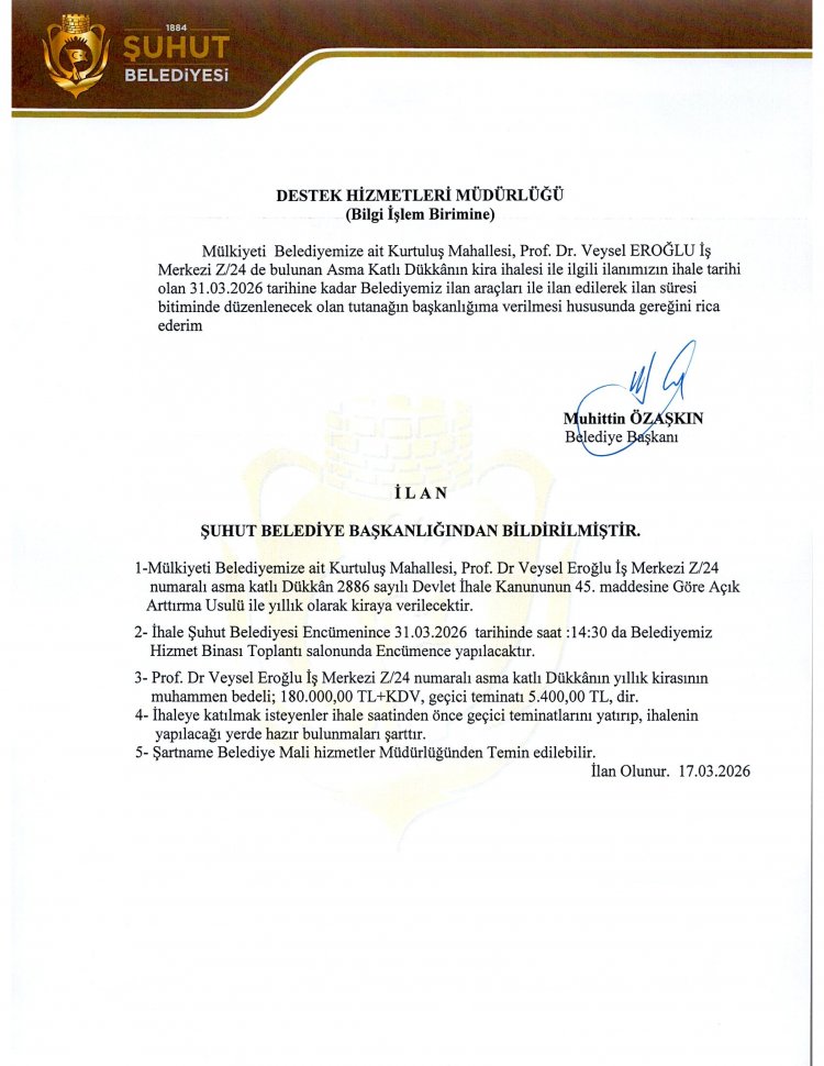 MÜLKİYETİ BELEDİYEMİZE AİT KURTULUŞ MAHALLESİ, PROF. DR. VEYSEL EROĞLU İŞ MERKEZİ Z/24 DE BULUNAN ASMA KATLI DÜKKANIN KİRA İHALE BİLGİLERİ EKTE SUNULMUŞTUR.