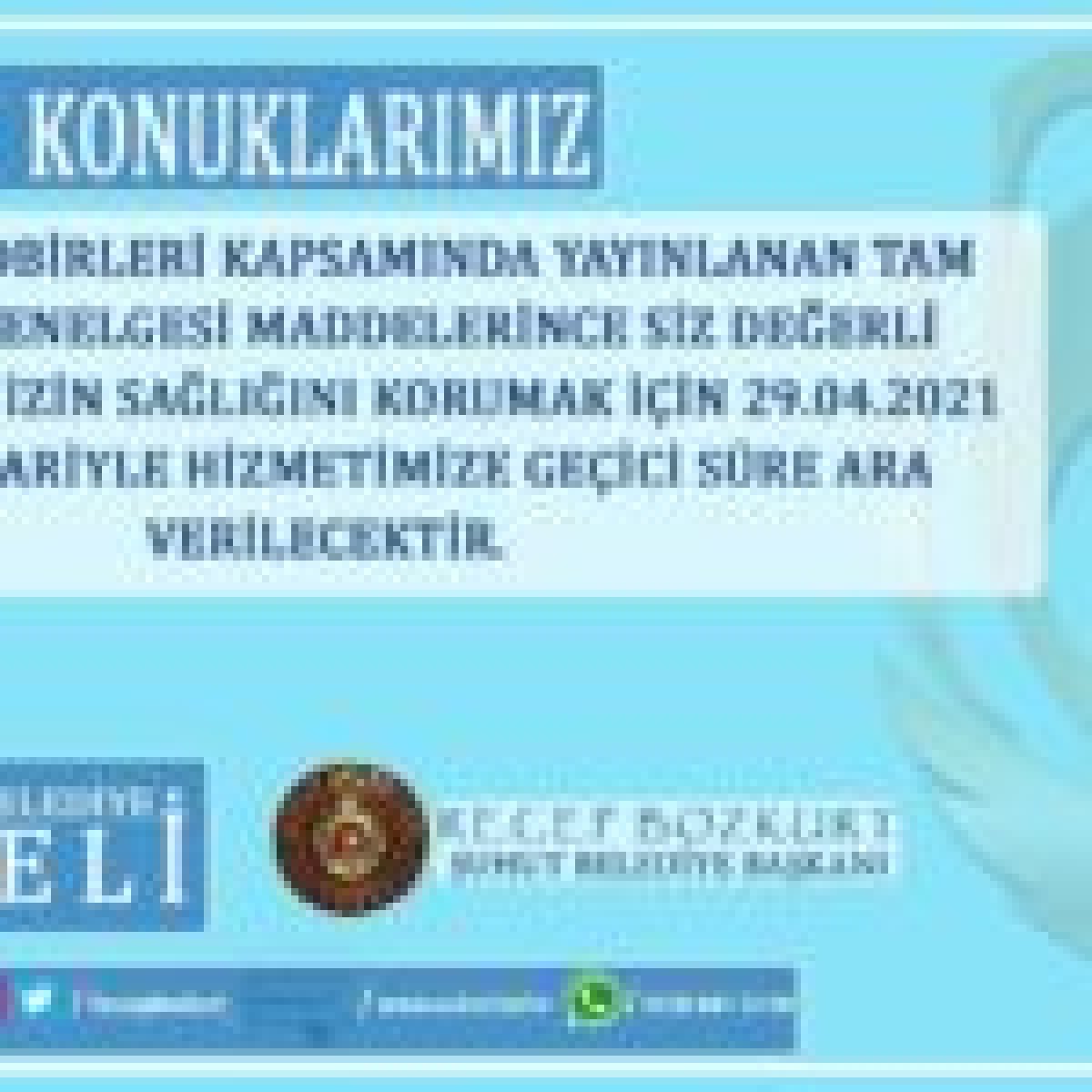 Şuhut Belediye Oteli Olarak Covid-19 Tedbirleri kapsamında yayınlanan tam kapanma genelgesi maddelerince siz değerli misafirlerimizin sağlığını korumak için 29.04.2021 tarihi itibariyle hizmetimize geçici süre ara veriyoruz.Tüm konuklarımıza duyurulur.