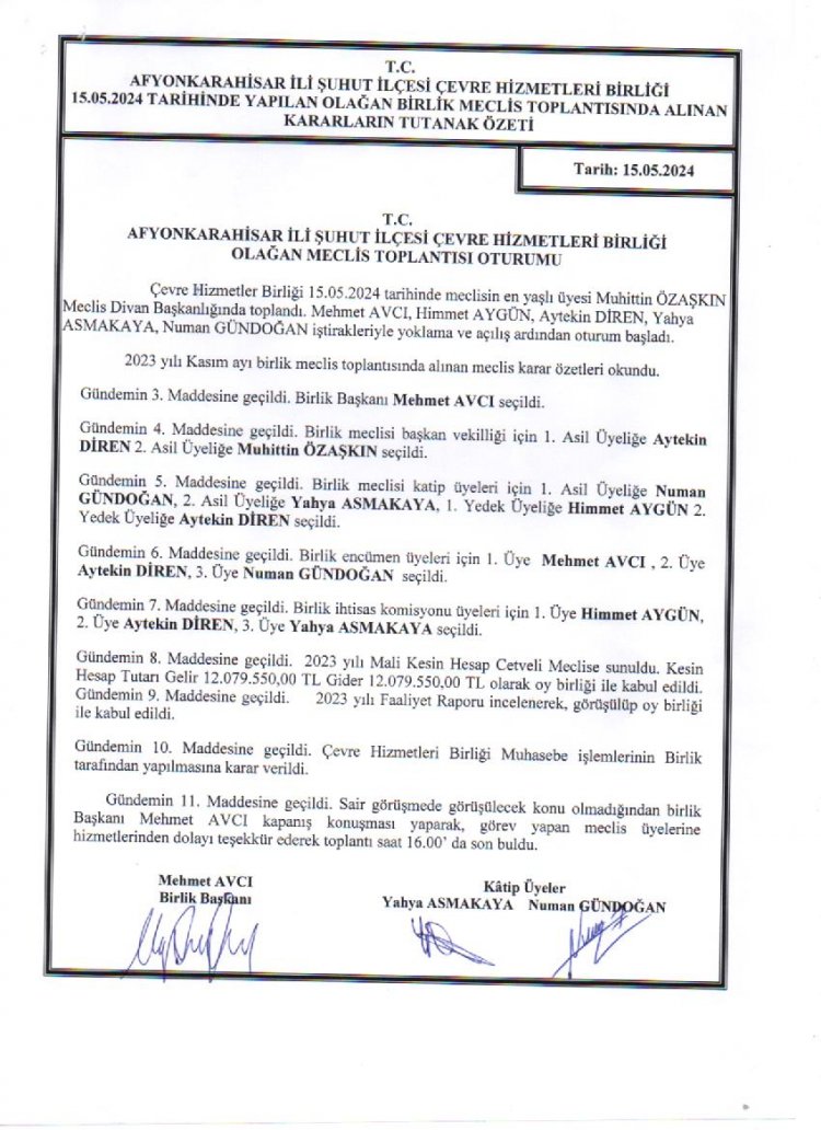 ÇEVRE HİZMETLERİ BİRLİĞİ OLAĞAN MECLİS TOPLANTISI KARAR ÖZETLERİ
