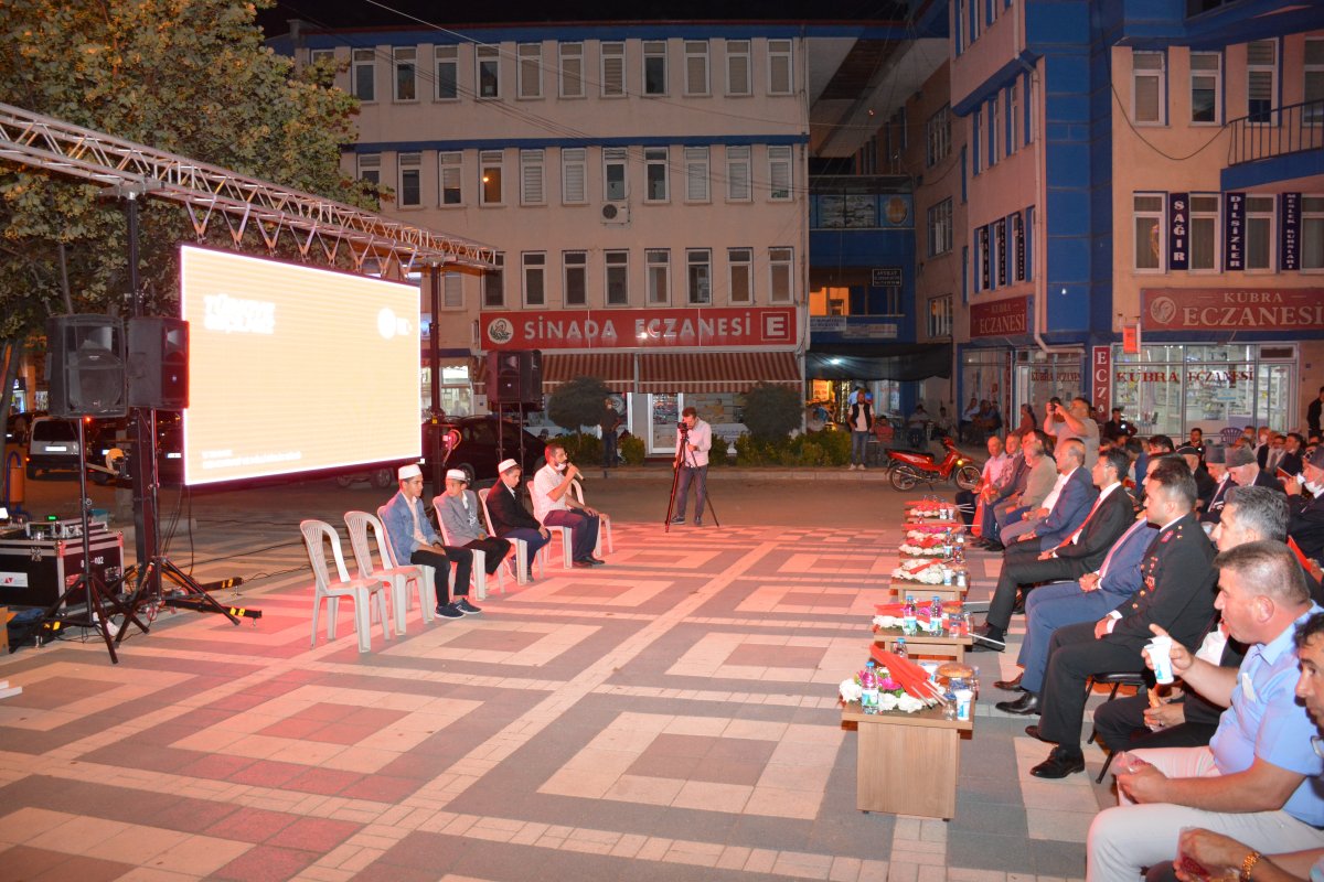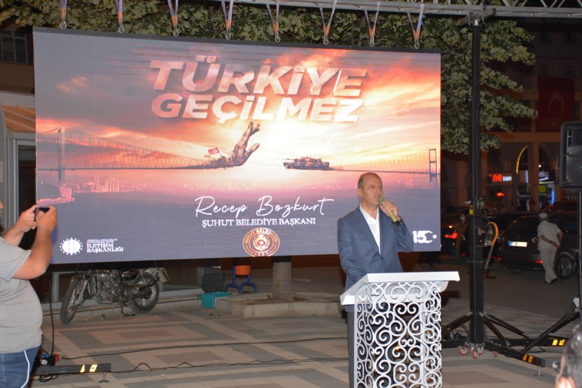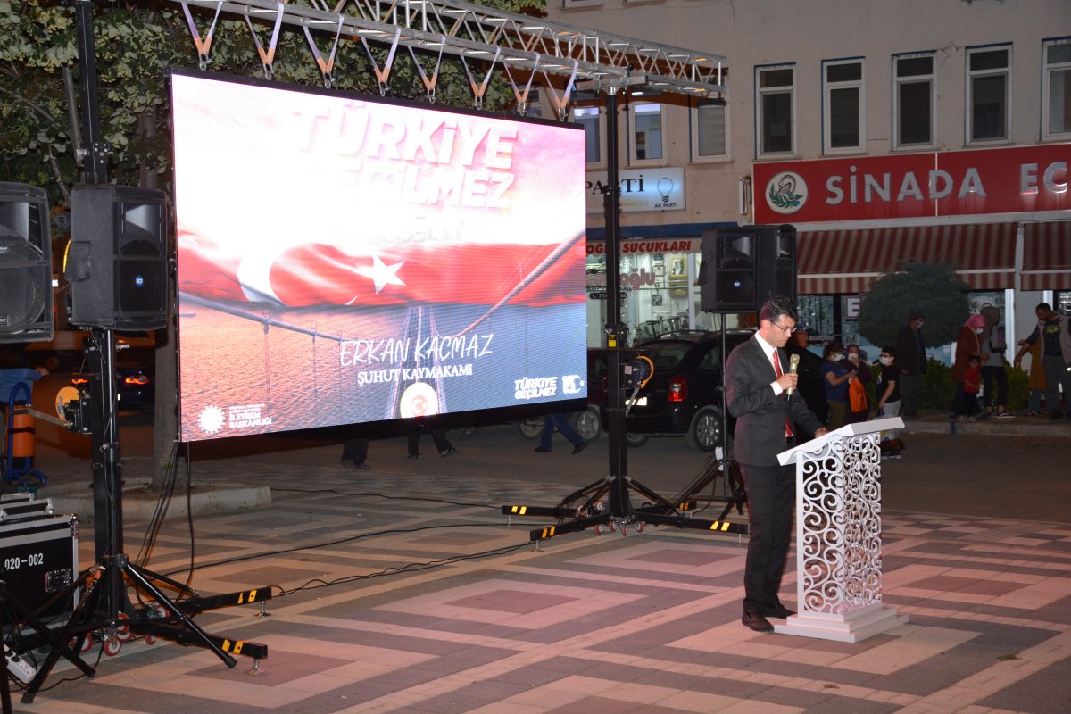 Şuhut Belediye meydanında düzenlenen programa vatandaşlar maske kontrolünün ardından meydana alındı.Oturma düzeninin de sosyal mesafe kuralına uygun hazırlandığı program Cumhurbaşkanı Recep Tayyip Erdoğan’ın canlı yayımlanan Millete Sesleniş konuşması ile başladı. Konuşmanın ardından saygı duruşu ve İstiklal marşı ile başlayan program sela ve Kur-an’ı Kerim tilaveti ile devam etti.Programda Konuşan Başkan Bozkurt'' SAYIN KAYMAKAMIM, KOMUTANIM, KURUM MÜDÜRLERİM VE AMİRLERİM, İLÇE BAŞKANLARIMIZ, KIYMETLİ İL GENEL MECLİSİ VE BELEDİYE MECLİSİ ÜYELERİMİZ, KIYMETLİ MİSAFİRLER, ÇOK DEĞERLİ ŞUHUTLU HEMŞEHRİLERİM. 15 Temmuz Demokrasi ve Milli Birlik Günü anma programına Hepiniz Hoş Geldiniz. Sizleri en kalbi duygularımla, hürmet, muhabbet ve saygıyla selamlıyorum. Bugün burada Şuhut Şehir meydanımızda FETÖ Terör Örgütü'nün 15 Temmuz 2016'daki darbe girişimine karşı Aziz Milletimizin kahramanca bir mücadeleyle elde ettiği zaferin beşinci yılını idrak ediyoruz. 15 Temmuz Gecesi Milletimiz ağır bir ihanete, vatanımız hain bir işgal girişimine maruz kaldı. Fakat Cenâb-ı Hak’kın yardımı ile aziz milletimiz, vatanına, bayrağına, ezanına ve iradesine sahip çıktı. Dine hizmet ediyor gibi görünerek yıllarca menfaat devşirenlerin emellerini boşa çıkardı. Zalimlerin tuzaklarını başlarına geçirdi. Kıymetli Hemşehrilerim! Yüce Kitabımız Kur’an-ı Kerimde şöyle buyrulur: “Onlara ‘Yeryüzünde fesat çıkarmayın’ denildiğinde, ‘Biz ancak ıslah edicileriz’ derler. Şunu bilin ki onlar bozguncuların ta kendileridir, lakin anlamak istemezler.” İyi bilinmelidir ki 15 Temmuz’da milletimizin istiklal ve istikbaline kasteden FETÖ, bir fitne şebekesidir. Dinî bir cemaat değildir. Dinimizi, Kitabımızı, Peygamberimizi, sadakamızı, kurbanımızı, mukaddes olan nice değerlerimizi istismar etmiştir. Göz bebeğimiz olan gençlerimizi sinsi planlarla ana babasına ve milletine düşman hale getirmiştir. Samimi müminleri kandırarak kazandıklarını zannedenler, hakikatte yalnızca kendilerini kandırmıştır. O halde, bilinçli, sağduyulu ve dirayetli olalım. Milli ve manevi değerlerimizi istismar etmeye çalışanlara asla fırsat vermeyelim. Kur’an-ı Kerim’in rehberliği, Peygamberimizin örnekliği hayatımıza istikamet verecektir. Güvenilir kaynaklardan öğreneceğimiz sahih dinî bilgiyle yaşayalım. Vatanımızın selameti, devletimizin bekası ve milletimizin huzuru için birlik ve beraberliğimizi koruyalım. Ey! terör örgütleri, Ey! Teröre destek veren Ülkeler, Ey! Terör örgütlerinden İktidar umanlar.Sizlere Cumhuriyetin Kazanıldığı,Zafer Meşalesinin Yakıldığı Topraklardan Şuhut’tan Sesleniyorum! Devletimizi yıkamayacaksınız, Bayrağımızı indiremeyeceksiniz, Milletimizi boyun eğdiremeyeceksiniz, Ezanlarımızı susturamayacaksınız, Ülkemizi bölemeyeceksiniz. Bu vesile ile konuşmamı bitirirken geçmişten günümüze vatan uğruna canını feda eden aziz şehitlerimizi rahmetle, kahraman gazilerimizi minnet ve şükranla yâd ediyorum''dedi. Başkan Bozkurt'un konuşmasının ardından İlçe Kaymakamı Erkan Kaçmaz'da konuşma yaptı.Protokol konuşmalarının ardından Türkiye Geçilmez teması üzerinde hazırlanan videolar izlendi. Müftülük programı ile anma etkinlikleri gece geç saatlere kadar program devam etti.Program vatandaşların yoğun katılımı ile gerçekleşti.