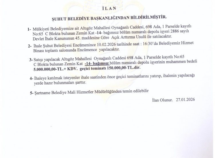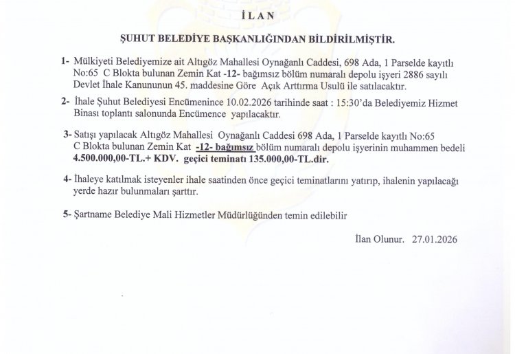 MÜLKİYETİ BELEDİYEMİZE AİT ALTIGÖZ MAHALLESİ OYNAĞANLI CADDESİNDE BULUNAN 3 ADET MESKEN VE 3 ADET DEPOLU İŞ YERİNİN İHALE BİLGİLERİ EKTE SUNULMUŞTUR.