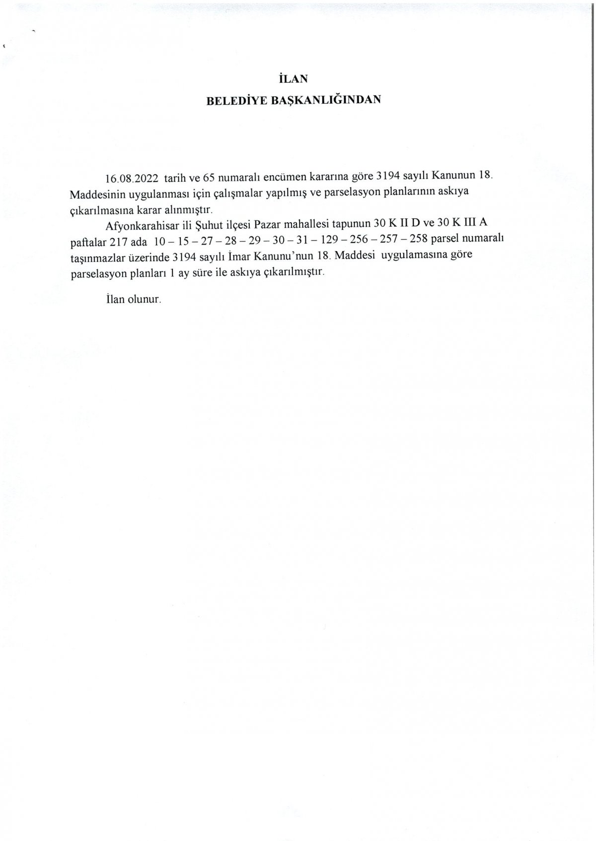 ŞUHUT BELEDİYESİ İMAR VE ŞEHİRCİLİK MÜDÜRLÜĞÜNDEN İLAN