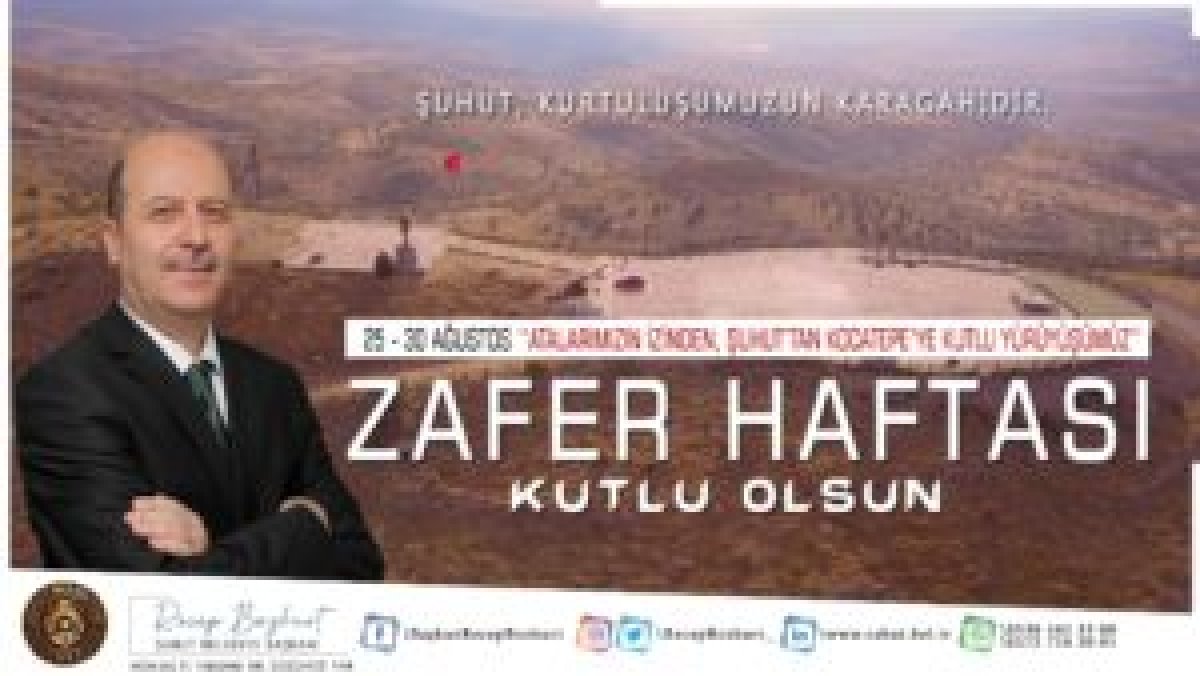 Şuhut Belediye Başkanı Recep Bozkurt 25-30 Ağustos Zafer Haftası dolayısıyla bir mesaj yayımladı.Başkan Bozkurt mesajında’’Başkomutan Mustafa Kemal Paşa, 1922 yılının 25 Ağustos’u 26’ya bağlayan gecesinde Şuhut’a gelmiş burada büyük taarruzun son planlarını hacı veli konağında yapmıştır.Beraberindeki Fevzi ve İsmet Paşalarla Kocatepe’ye yürümüş, burada şafak sökerken verdiği “Ordular! İlk hedefiniz Akdeniz’dir, ileri!..” emriyle Büyük Taarruzu başlatmıştır. Şuhut’tan başlayıp Kocatepe’de sona eren bu 19 kilometrelik yol, Türk milletini istiklâl mücadelesinde zafere götüren bir yoldur. 26 Ağustos sabahı çetin bir mücadele sonucunda kahraman ordumuz düşmanı tarumar etti. 15 günün sonunda da Yunan ordusunu İzmir’den denize döküldü. Bu idrak ve şuurla kahraman ecdadın torunları olarak, aradan uzun seneler geçmiş olsa da yüzlerce kilometre uzaklardan yollara düşüp, Büyük Zafer Yürüyüşünde her geçen yıl daha yoğun katılımla ve o günkü ruh ve heyecanı yaşayarak ecdadın izinde yürümekteyiz.
