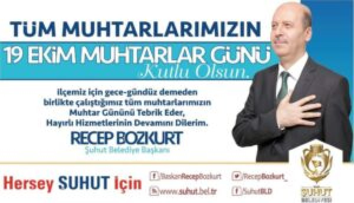 Bu duygu ve düşüncelerle başta Şuhutumuzda görev yapmakta olan değerli köy ve mahalle muhtarlarımızın “19 Ekim Muhtarlar Günü’nü” en kalbi duygularımla kutluyor, Yüce Rabbim’den çalışmalarında kolaylıklar, başarılar ve esenlikler diliyorum.”dedi.