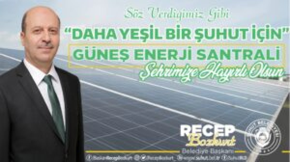 Şuhut Belediyesi Güneş Enerji Projesinin kısa sürede inşaasına başlanacağını aktaran Başkan Bozkurt''1 MW'lık güneş enerji santralimiz ilçemize hayırlı uğurlu olsun.Tüm detayları kısa süre kamuoyuyla paylaşacağız.Bu konuda destek olan tüm ekip arkadaşlarıma teşekkür ediyorum''dedi.